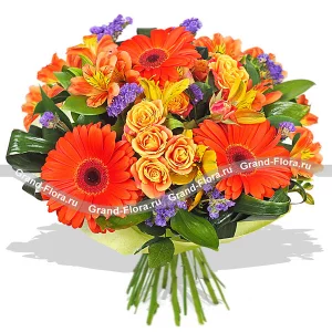 Летнее настроение + мишка - букет из роз, гербер и хризантем