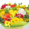 Уменьшенный: роза красная - 3 шт., роза белая - 1 шт., гербера оранжевая/красная - 1 шт., кустовая роза желтая/кремовая - 1 шт., хризантема кустовая желтая - 1 шт., декоративная зелень, упаковка