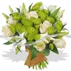 Уменьшенный: роза белая - 3 шт., лилия белая - 1 шт., хризантема одноголовая зеленая (шамрок) - 5 шт., сетка коричневая.