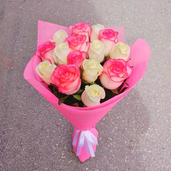 Роза белая (кремовая) и розовая 70 см - 15 шт , упаковка фетр.