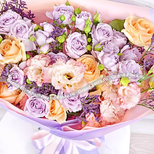 Чарующие и необыкновенные розы сиреневого и кремового  оттенка, розовая эустома и фиолетовый лимониум в букете выглядят гармонично, роскошно и привлекательно.