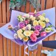 Предложили замену фиолетовых роз на эустому и розовые розы. Согласилась. Букет получился отличный! Более яркий чем на фото, но я очень довольна.